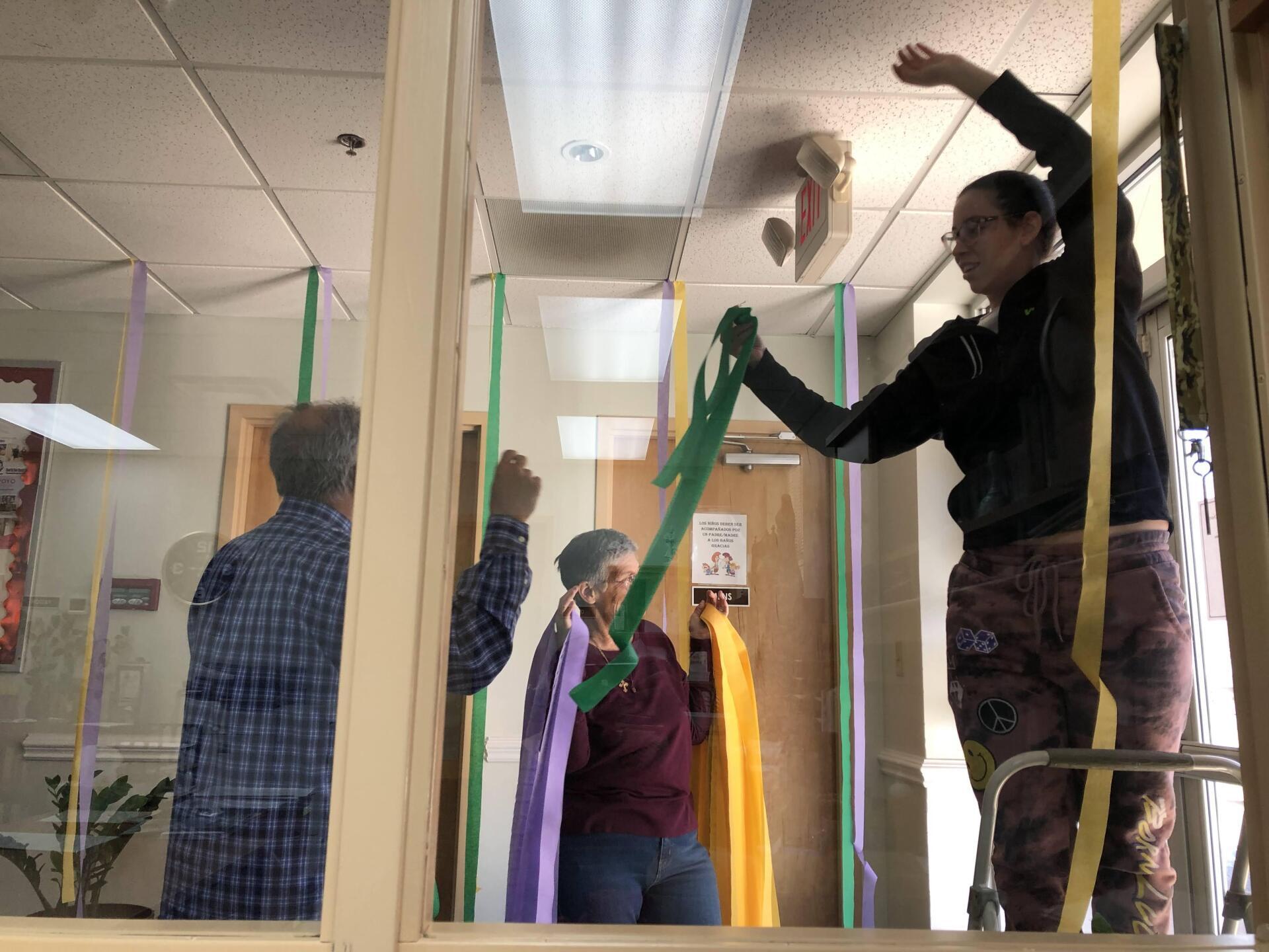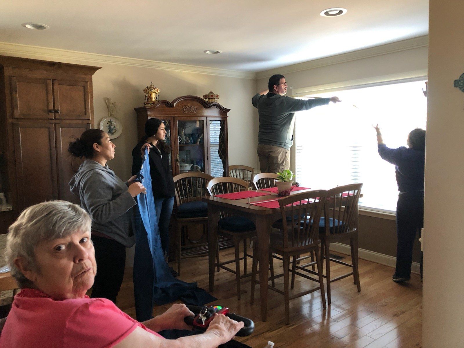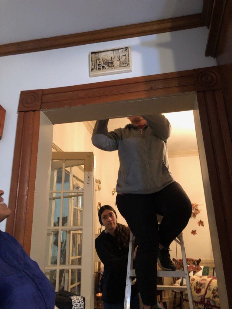 At Mary Ann's hanging some curtain rods. More to be done next month.