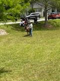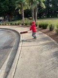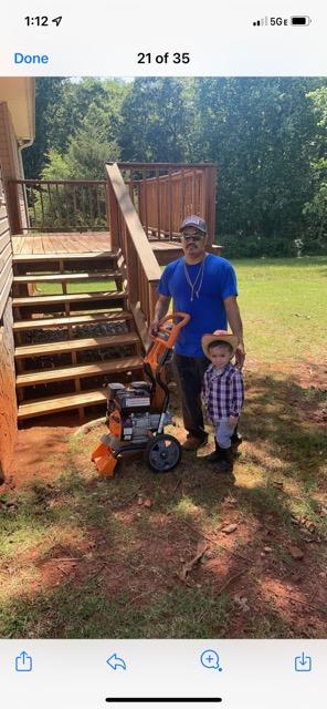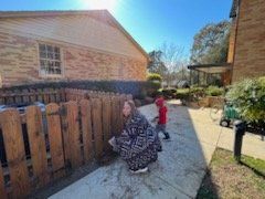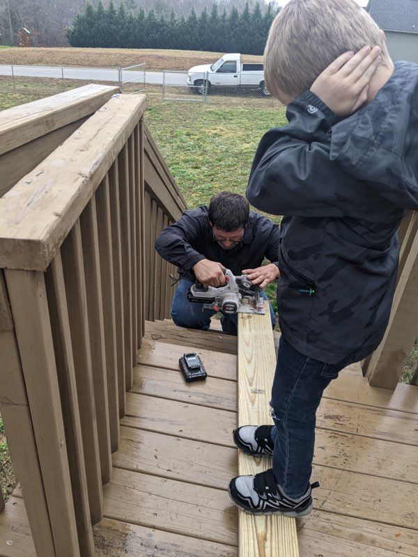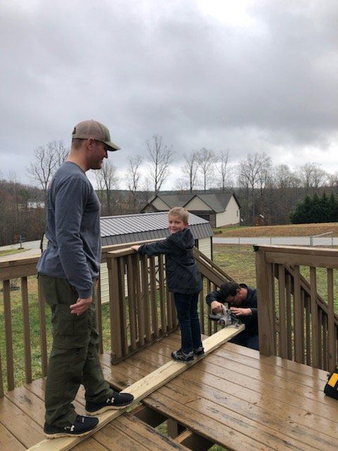 KOC's Kyle and Mervin repair the deck and mail box post at Mary Anne's home with young assistant Graham during Missionary Saturday.