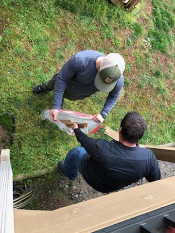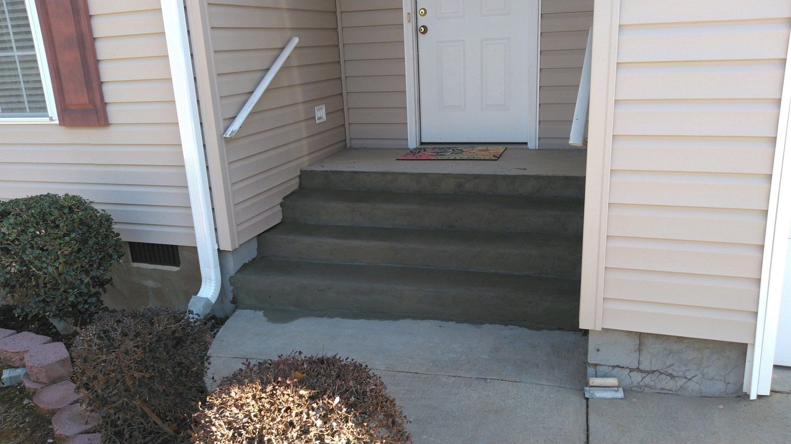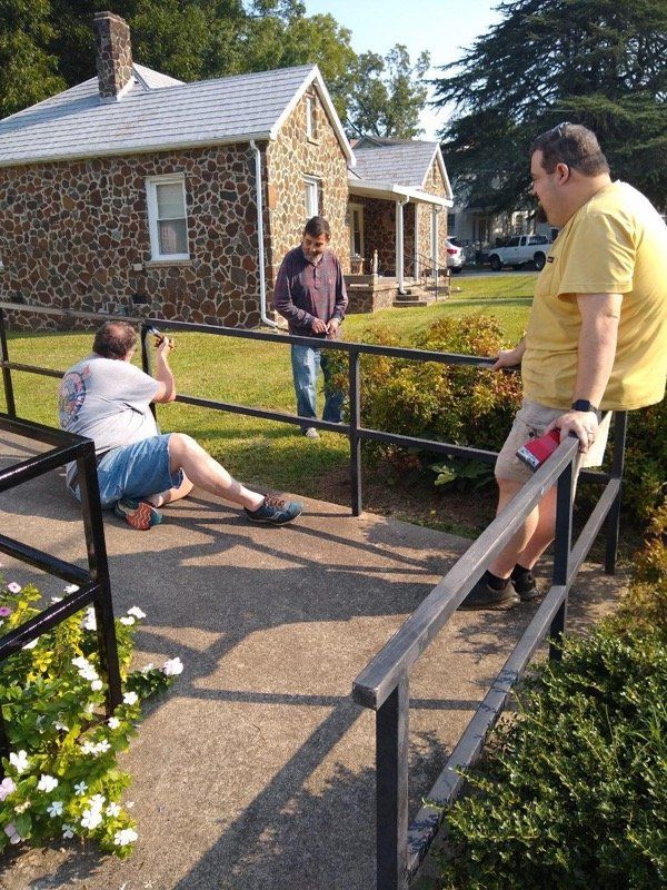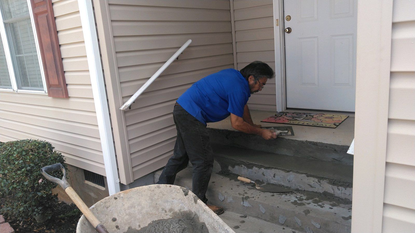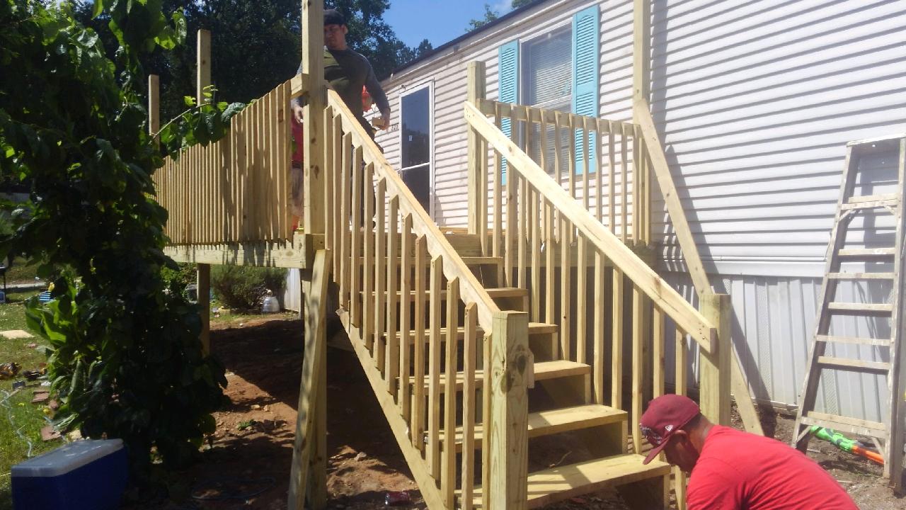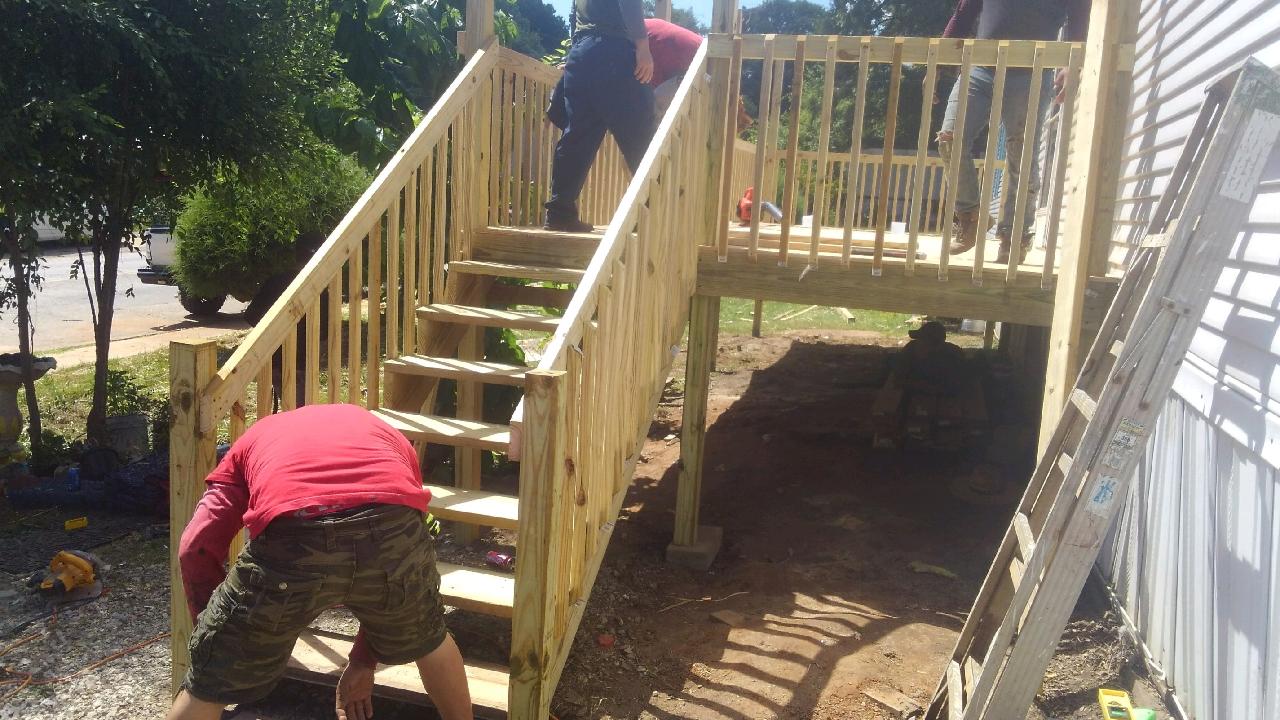 Missionary Saturday volunteers repair the steps of Diane Sellaire's home.
