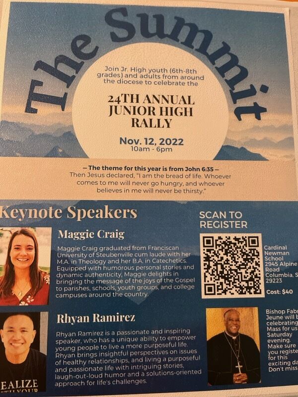 Magi, our youth minister along with Sherly, Lizbeth and Megan participated in the 24th Annual Junior High Rally, The Summit, in Columbia, SC on November 12, 2022. They enjoyed keynote speakers with inspiring messages for our youth. Bishop Jacques Fabre-Jeune celebrated Mass on Saturday evening.