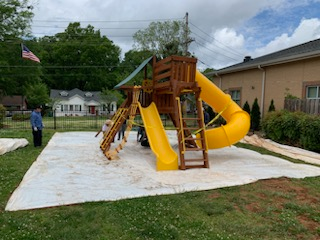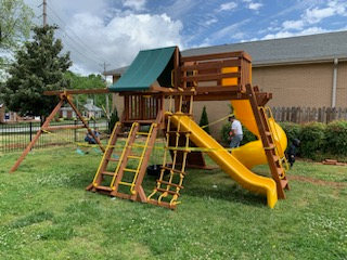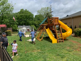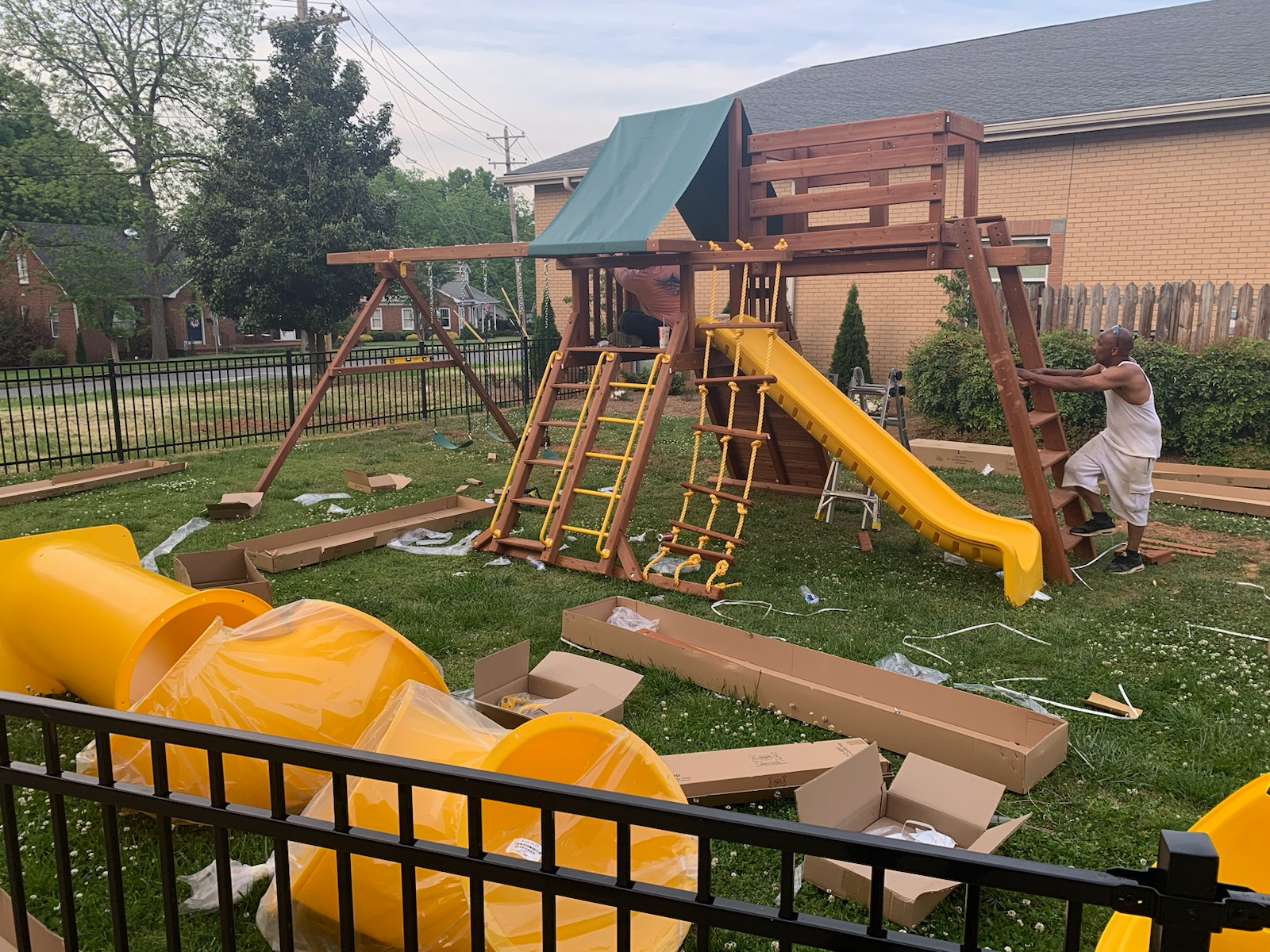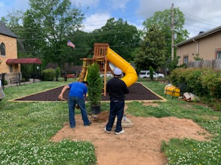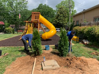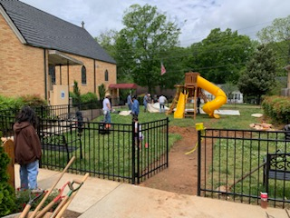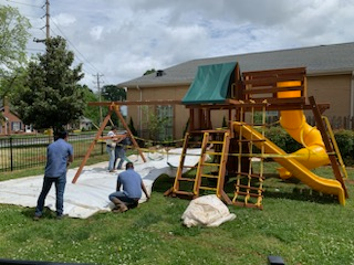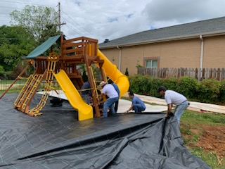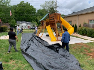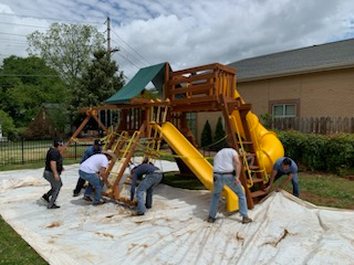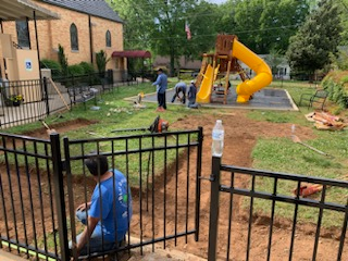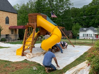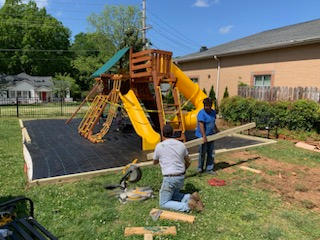 Volunteers Work to Install the Playground in the Holy Family Garden, April 22, 2023
